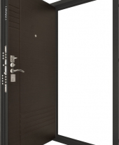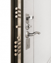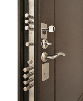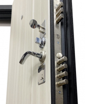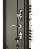 Защита: 5 противосъемных ригелей, врезная броненакладка для защиты цилиндра от выбивания и высверливания.